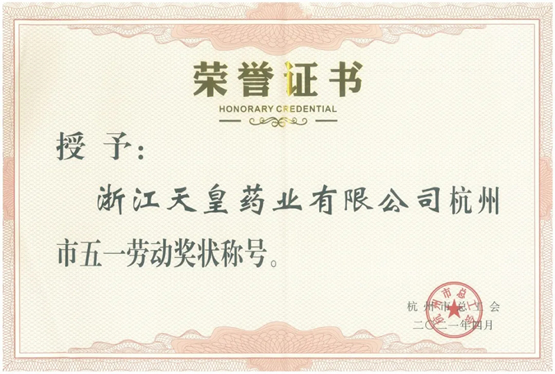 4月26日下午,杭州市“咱们工人有力量 劳模工匠心向党”——杭州市职工“庆五一·迎七一”大会在市职工文化中心举行,会上隆重表彰了2021年杭州市五一劳动奖状(章)获得者。浙江天皇药业有限公司荣获了“杭州市五一劳动奖状”称号。