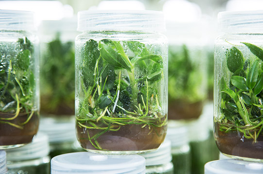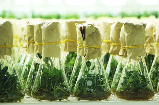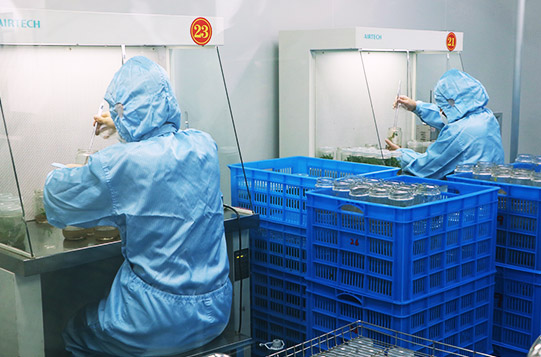 铁皮石斛选种后,组织培养育苗是第一关。三十多年来,公司不断发展扩大铁皮石斛组培育苗规模,现已建成6万平方米的铁皮石斛组培苗实验室,满足铁皮石斛产业化的需求。 公司实施严格规范的管理,对组培苗培育环境有严格的规范和标准。不同苗龄的试管苗,用不同营养成分配比的培养基培育,试管苗瓶放置在适宜的温度、湿度、光照的室内环境中,由专人管理检查。